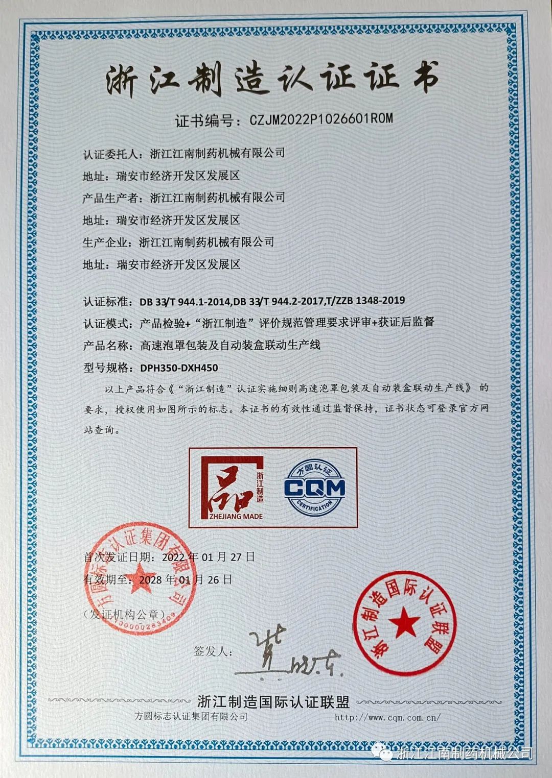 浙江江南制药机械有限公司收到了由浙江制造国际认证联盟颁发的“浙江制造”认证证书。